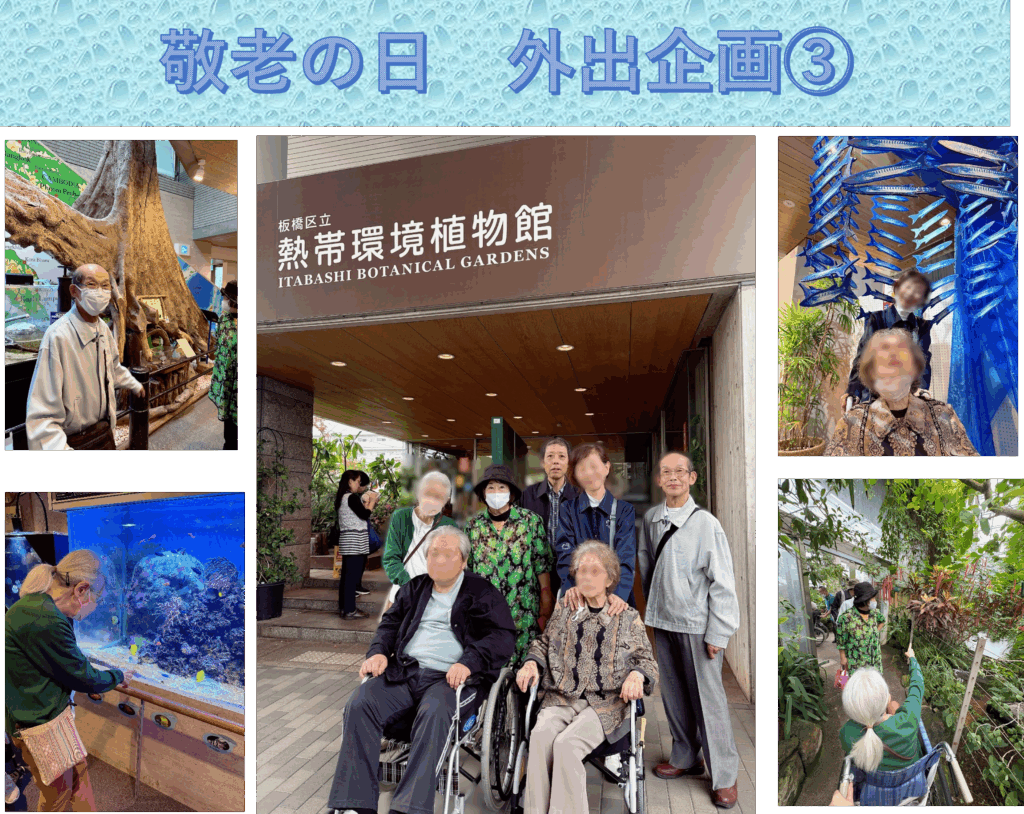 敬老の日 外出企画③として最後に10月15日(水)に《板橋区立 熱帯環境植物館》へ出かけました。車いすでも見学しやすいように案内していただけて上から順に見学できたようです。ご家族・ボランティアの方にお手伝いしていただきながら植物だけでなく魚・カメ・カブトムシなどが見れたそうです。
